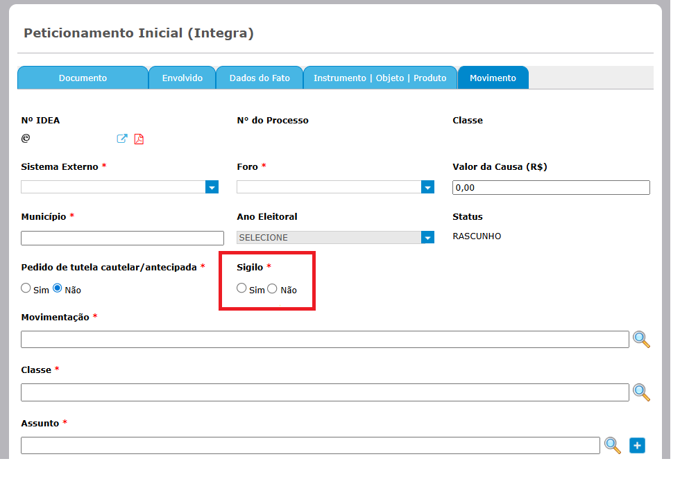 I – REMOÇÃO DA MARCAÇÃO PADRÃO DE SIGILO NO PETICIONAMENTO INICIAL: foi removida a marcação padrão “Não” no campo Sigilo, da tela Peticionamento Inicial (Integra), mantendo-se, contudo, a exigência de preenchimento obrigatório. A alteração tem por finalidade instar o usuário a decidir, de forma mais clara e assertiva, quanto à tramitação sigilosa ou não do processo no sistema externo do Poder Judiciário.