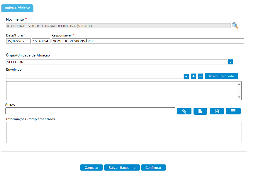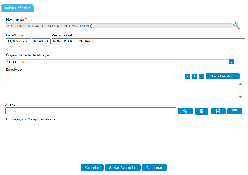 Clicando no botão “Baixa Definitiva” a página seguirá para realização de movimento “ATOS FINALÍSTICOS > Baixa Definitiva (920494)”: