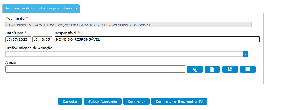 que a página seguirá para realização de movimento “ATOS FINALÍSTICOS > Reativação de cadastro ou procedimento (920495)”:
