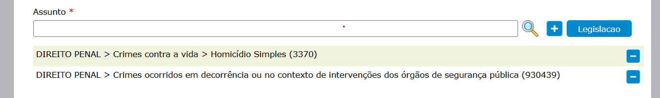 Passo 1: incluir o assunto principal, correspondente ao tipo penal apurado no caso (por exemplo: homicídio, lesão corporal, abuso de autoridade, etc.).