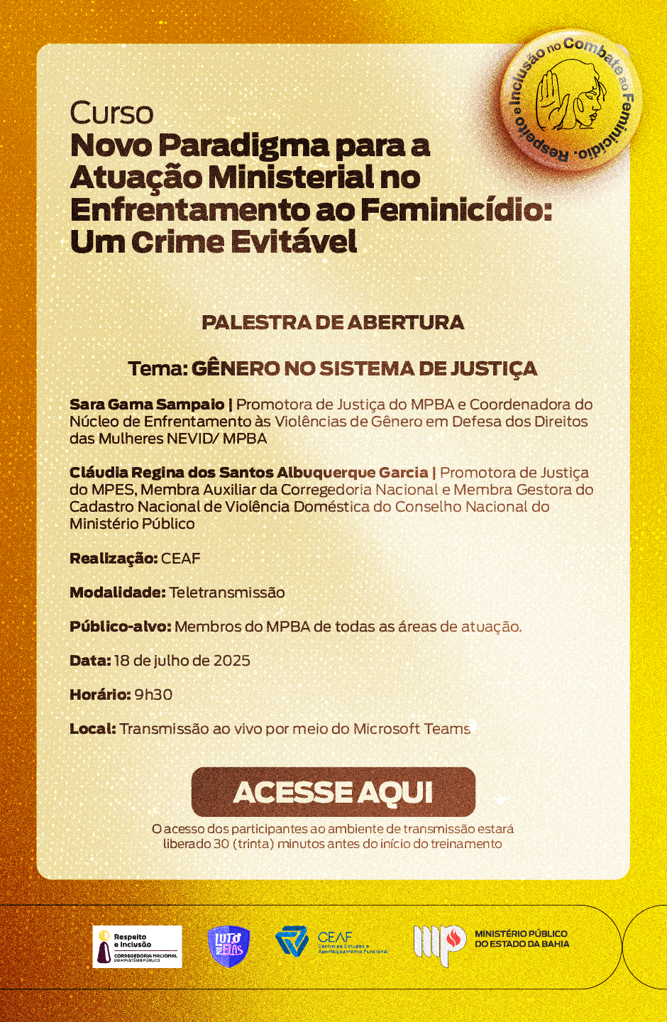 TRANSMISSÃO AO VIVO – Selo “Respeito e Inclusão no Combate ao Feminicídio” – Curso Novo Paradigma para a Atuação Ministerial no Enfrentamento ao Feminicídio: Um Crime Evitável