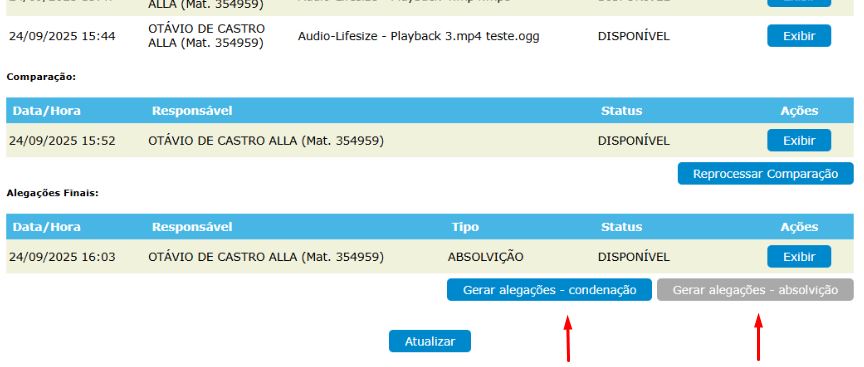 No dia 25/09/2025, às 12h30, foi incluído novo recurso na ferramenta de transcrições do IDEA, renomeada Transcrições | IA. Agora, além da transcrição inteligente de audiências judiciais e a possibilidade de comparação com os dados da denúncia (botão "Solicitar Comparação"), a ferramenta também elabora uma minuta de alegações finais com base nas transcrições e nos dados inseridos no processo. (clique para ampliar)Primeiramente, clique em Solicitar comparação, para gerar os dados que serão utilizados neste novo recurso. Em seguida, clique em Gerar alegações (pela condenação ou absolvição, conforme o caso). Reforçamos que, para que a comparação seja possível, é necessário que conste movimento de Denúncia ou Representação por Ato Infracional, com anexo; portanto, a geração de alegações também depende da existência de um desses movimentos. Nesta versão inicial da ferramenta, as peças são geradas com base apenas em parte dos dados disponíveis do processo. Estamos trabalhando para ampliar essa cobertura e proporcionar análises ainda mais abrangentes. Considere a possibilidade de revisão do conteúdo. Outros ajustes: Nas últimas atualizações, diversos outros ajustes foram aplicados em funcionalidades do sistema. Seguem alguns dos principais: - Novos Temas: foram incluídas duas novas opções de Tema para associação ao cadastro de Processo/Procedimento, por solicitação da Coordenadoria de Gestão Estratégica: ALFABETIZAÇÃO e MP A BORDO - TRAVESSIA LEGAL E SEGURA. - Novas variáveis para o Word Online: foram criadas novas variáveis para edição de modelos do Word Online: #{envolvidoCPF}, #{envolvidoNome} e #{envolvidoRG}. Estas variáveis são autopreenchidas com os referidos dados dos envolvidos, quando realizado o upload do documento no IDEA. - Indicação de responsável pela ciência de comunicações eletrônicas: para todas as comunicações eletrônicas com ciência posterior a 01/09/2025, o sistema passou a exibir o nome do usuário que a realizou. Esse dado é exibido ao passar o cursor sobre a data da ciência, na comunicação eletrônica que se encontrar disponível na aba Resumo do Processo ou na listagem de pendentes de resposta. - Nova opção de filtro em comunicações eletrônicas pendentes de resposta: foi incluída a opção "Hoje", para exibição somente das comunicações eletrônicas com vencimento no dia atual. - Remoção de "Manifestação sobre Pedido de Prisão" do Painel de Operações do CION. Este movimento já estava devidamente contemplado na opção Requerimento de Prisão, Liberdade ou Relaxamento.